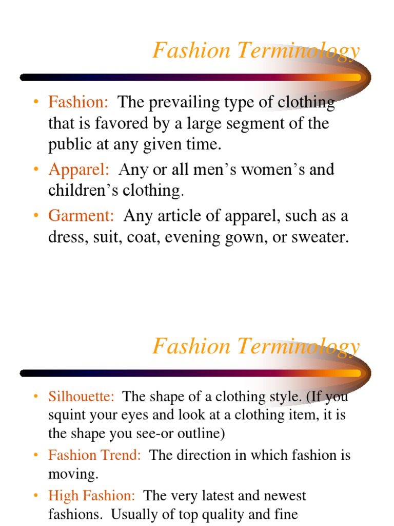 10 important elements of fashion. Sewing terms a glossary of 100 words used in sewing. Apparel is a common term used to describe clothing attire clothes andor garments.