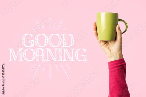 Stack Of Warm Knitted Clothes And Cup Of Tea On Table Stock