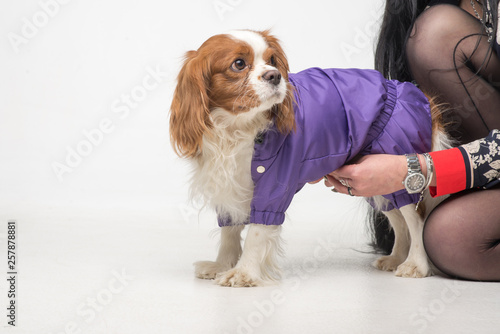 Cavalier King Charles Spaniel In Santa Dog Coat Against White