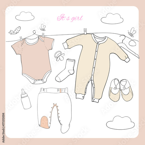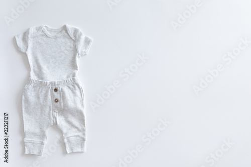 Set Of Baby Clothes And Accessories On White Wooden Background
