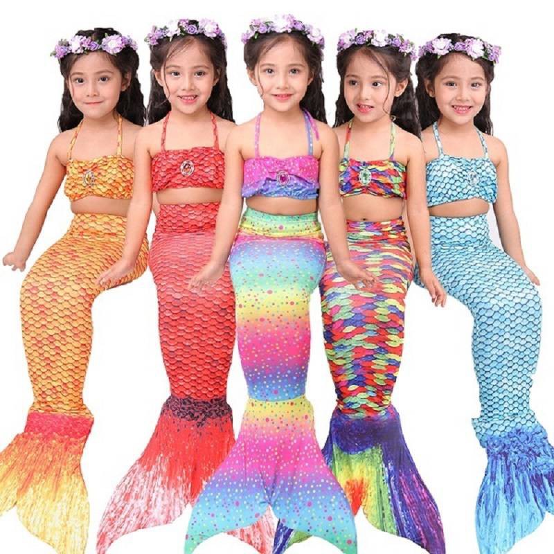 Three Piece Multicolor Kids Girls Mermaid Tail Swimmable Bikini