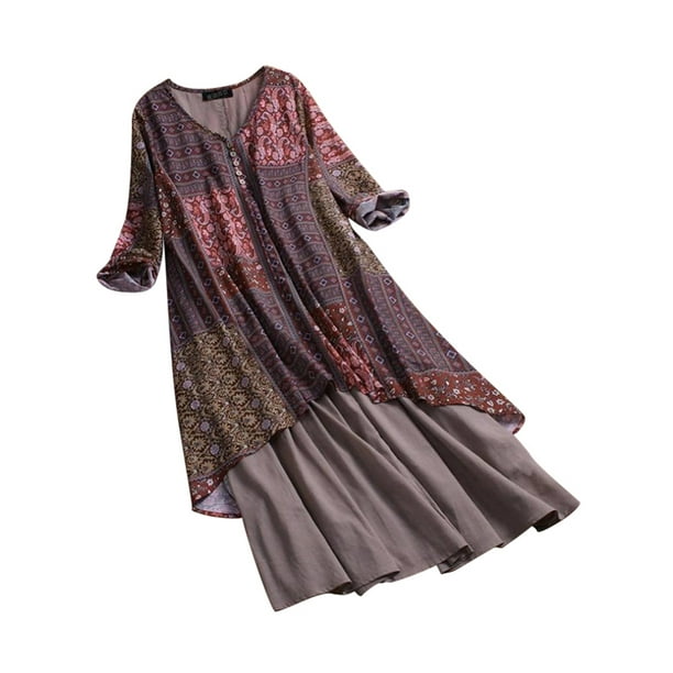 Ukap Plus Size Women Boho Cotton Linen Long Dress Half Sleeve