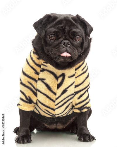 Small Black Pug Puppy Dog In Pink Clothes Isolated On White