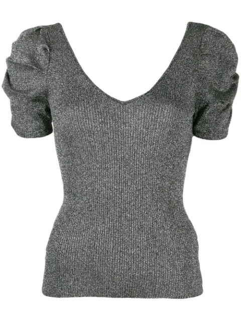 Sandro Metallic Puffed Sleeved Stretch Knit Top In Silver Modesens